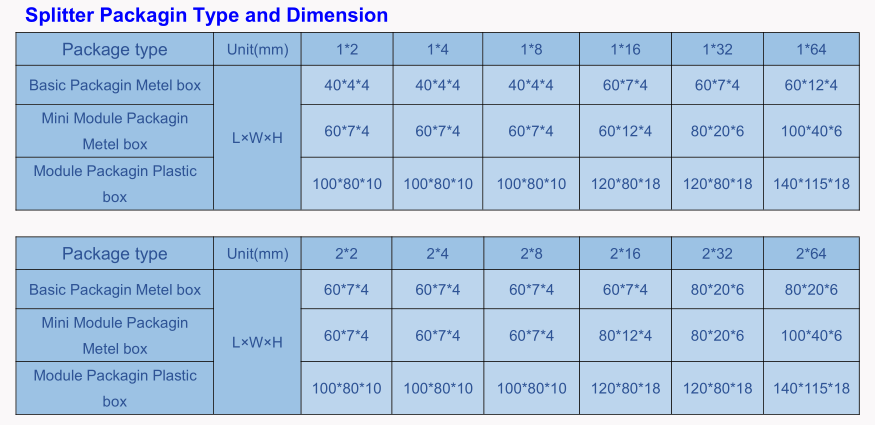 Fiber Optic PLC Splitter package type: bare fiber type, rack-mount type, modular type, Fanout type, 24-core tray type, 1u tray type, large steel pipe 900um, 12 core tray type, outdoor fiber box type.